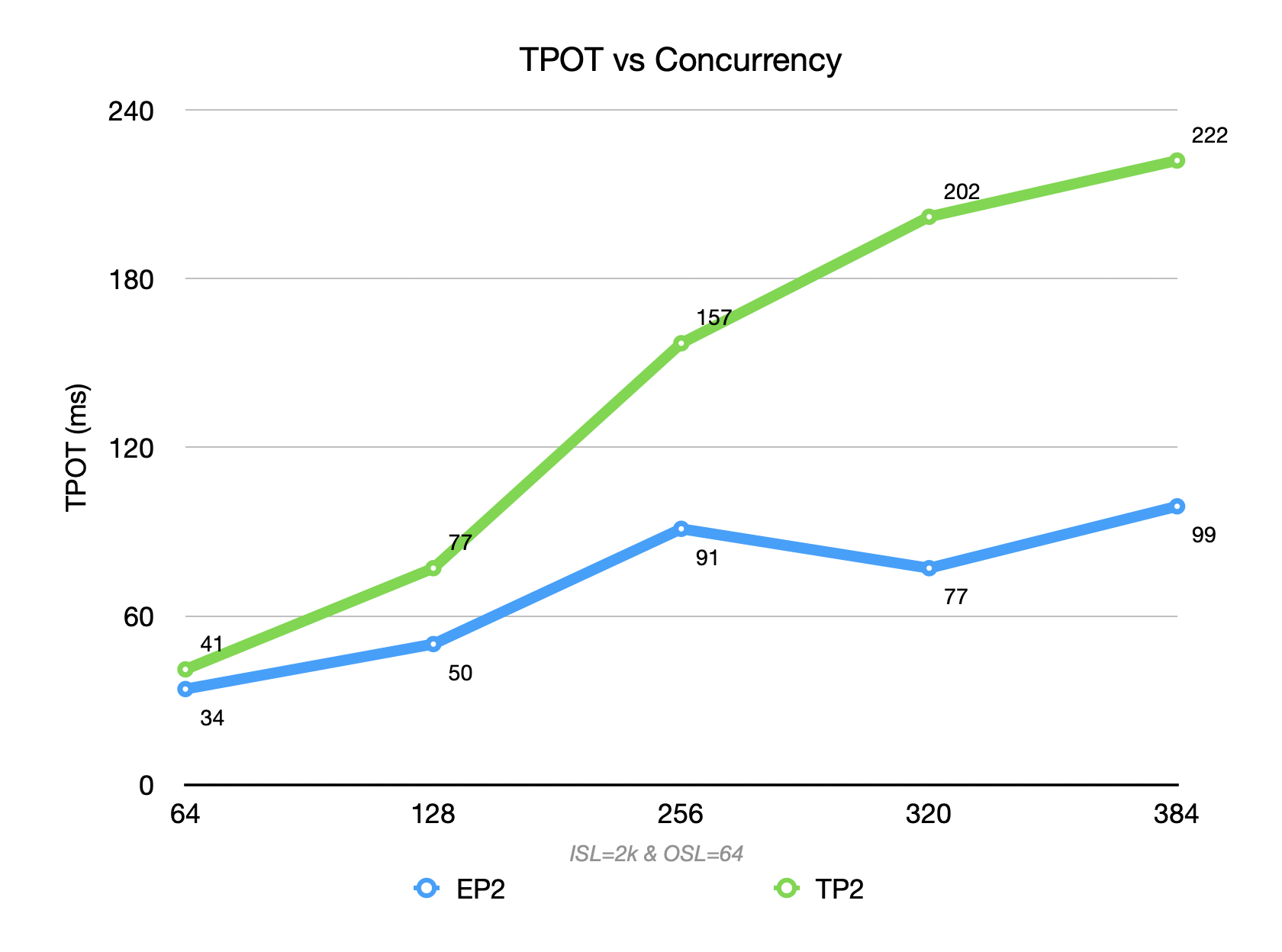 - In contrast, for output-heavy case, the TPOT advantage of EP=2 becomes dominant, and it is therefore the preferred configuration.