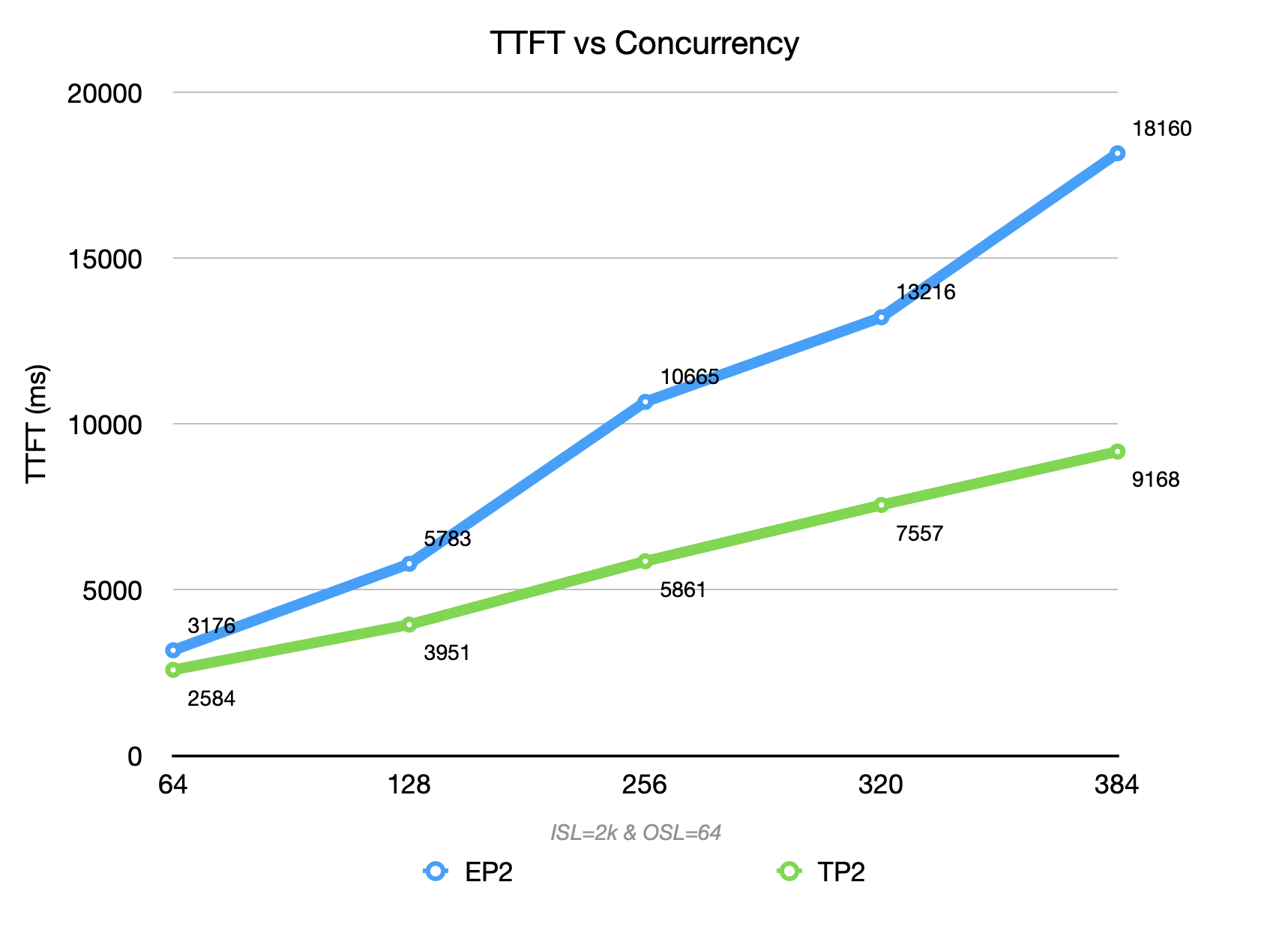 EP=2 (blue curve) reaches a throughput ceiling of 22K TGS, outperforming TP=2 (green curve) in both throughput and the growth slope of TTFT. This benefits from EP’s typical “large packet, low frequency” communication pattern, which better utilizes the high bandwidth of RDMA/NVLink under high concurrency.