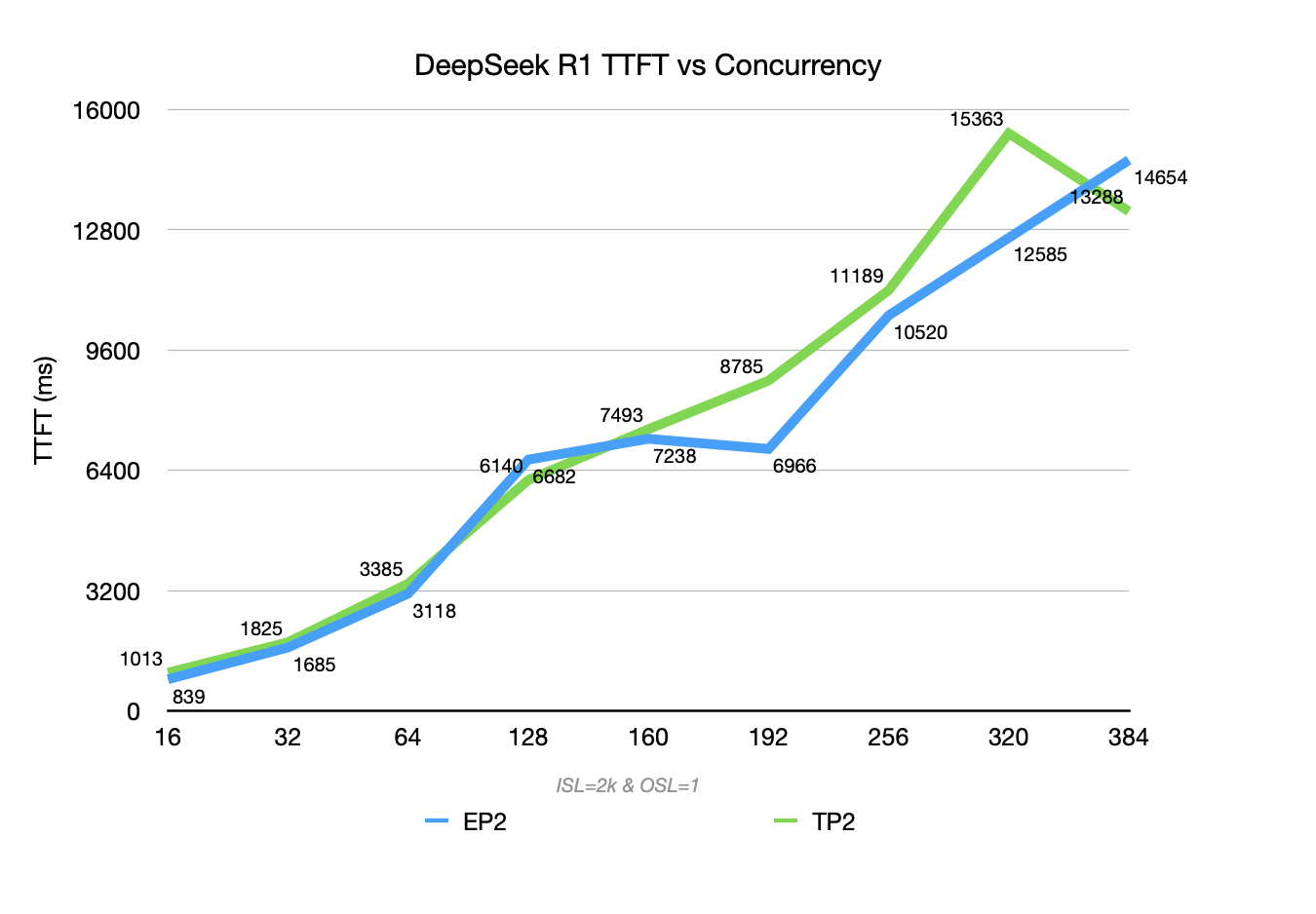 - DeepSeek R1 in EP2 can reach a peak Prefill throughput of ~ 22k TGS.